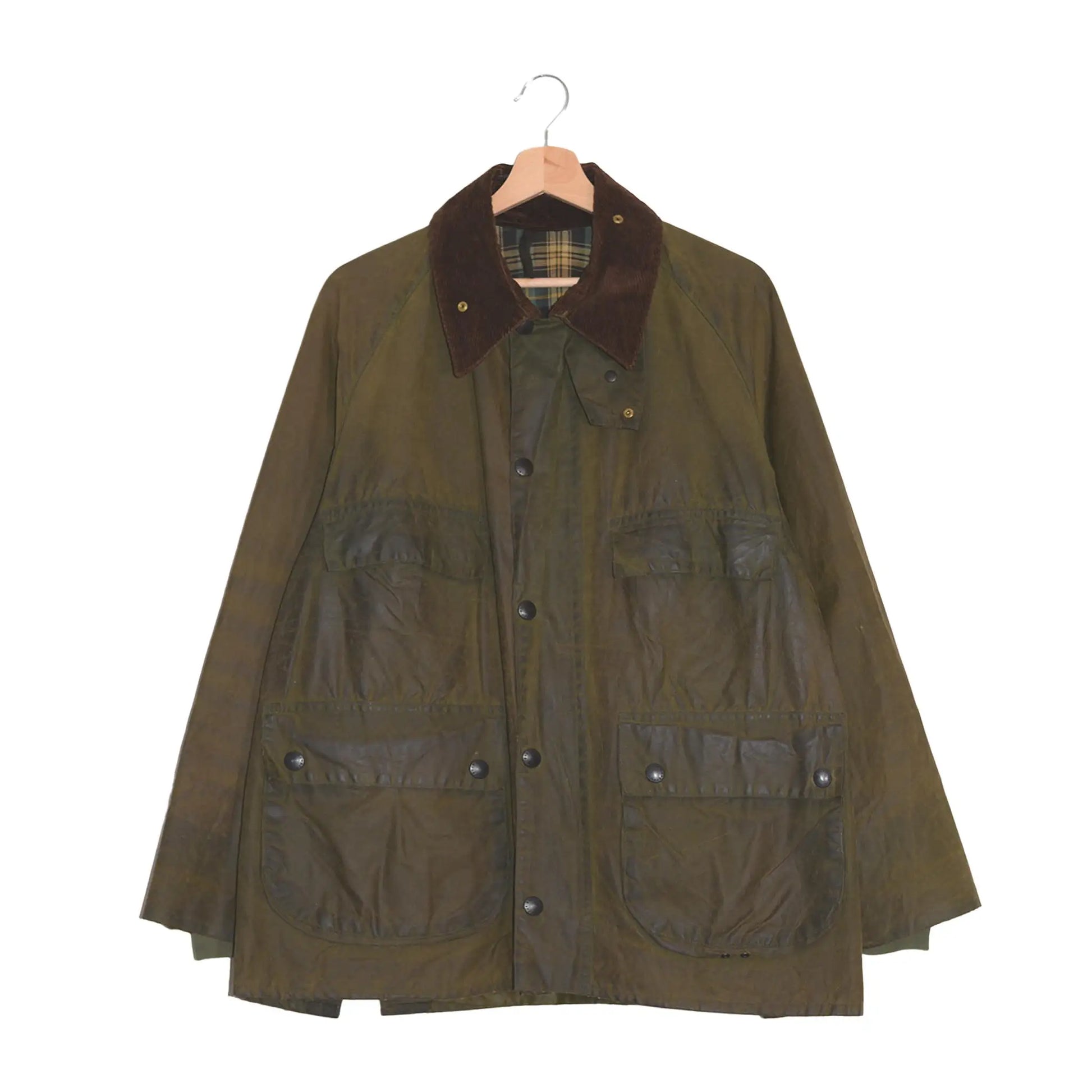 Questa versione è una rara variante a 4 tasche, meno comune rispetto al modello standard. Presenta il classico tessuto cerato verde oliva, colletto in velluto a coste e fodera interna tartan, elementi che esprimono al meglio l’heritage Barbour. Le quattro ampie tasche frontali ne aumentano la praticità, rendendola perfetta per l’uso outdoor o per chi cerca un capo funzionale dal fascino esclusivo.
