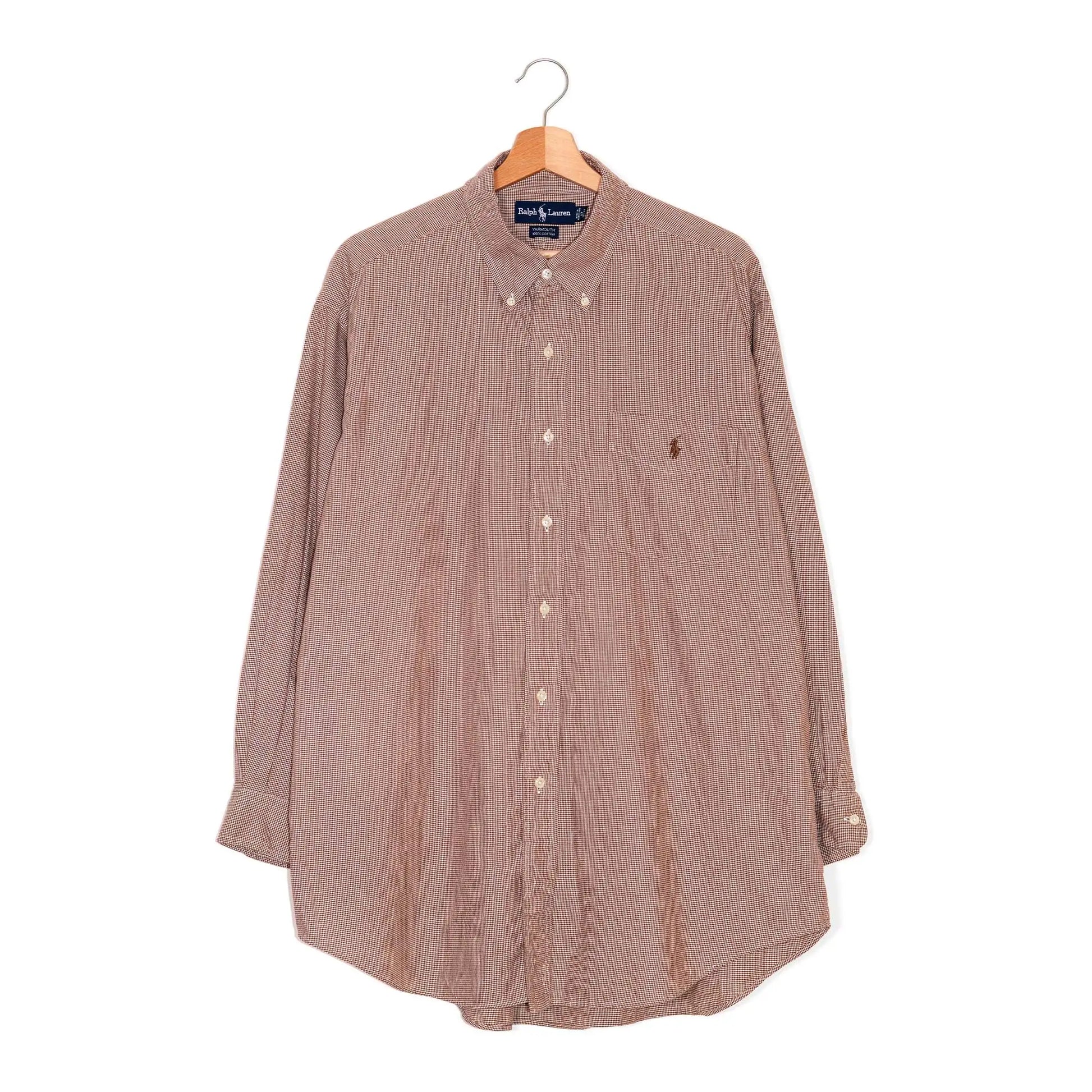 Camicia Ralph Lauren vintage modello Yarmouth a micro quadretti marroni. Classico modello a maniche lunghe con colletto button-down, taschino sul petto e logo ricamato. Vestibilità comoda e tessuto in cotone, ideale per look casual e rilassati.