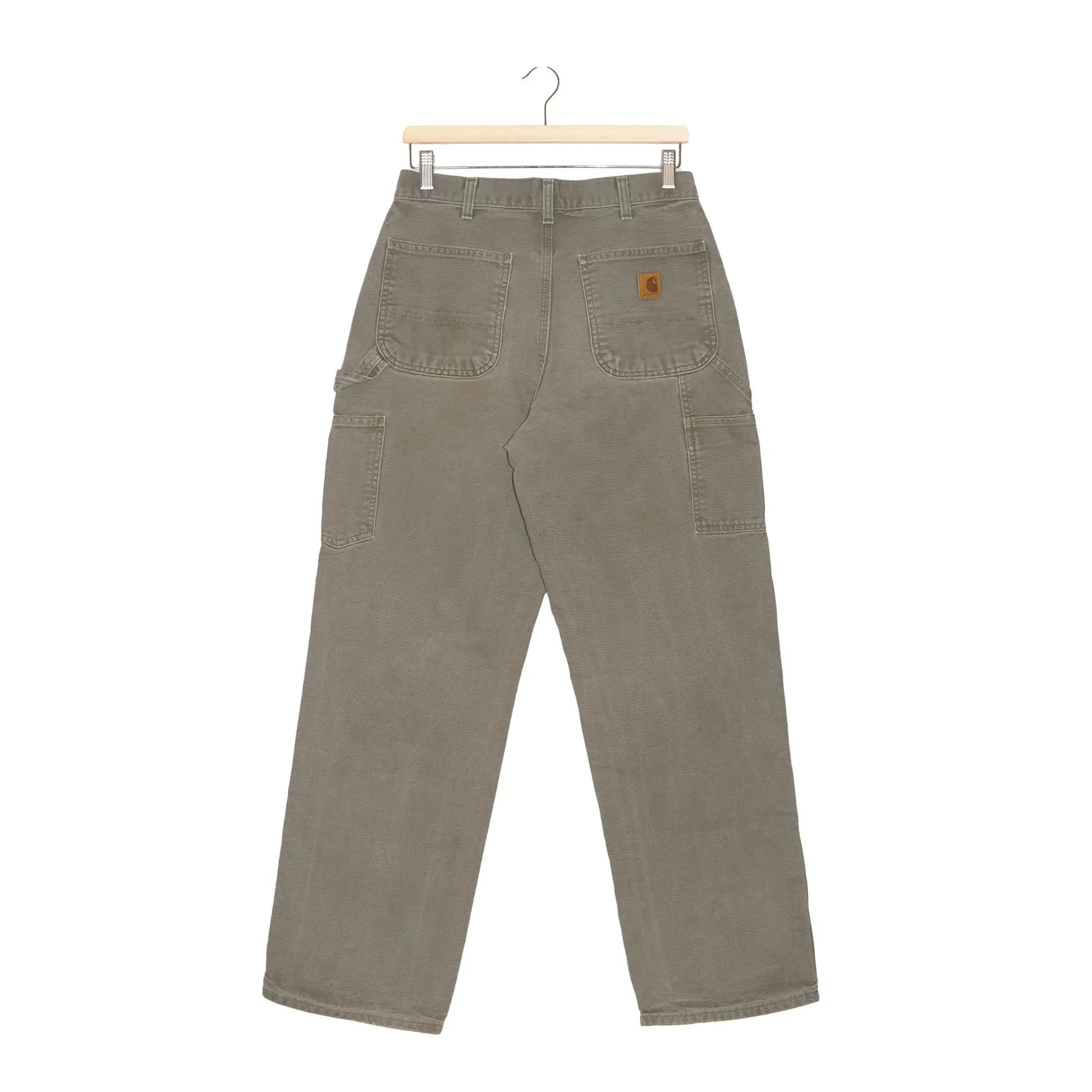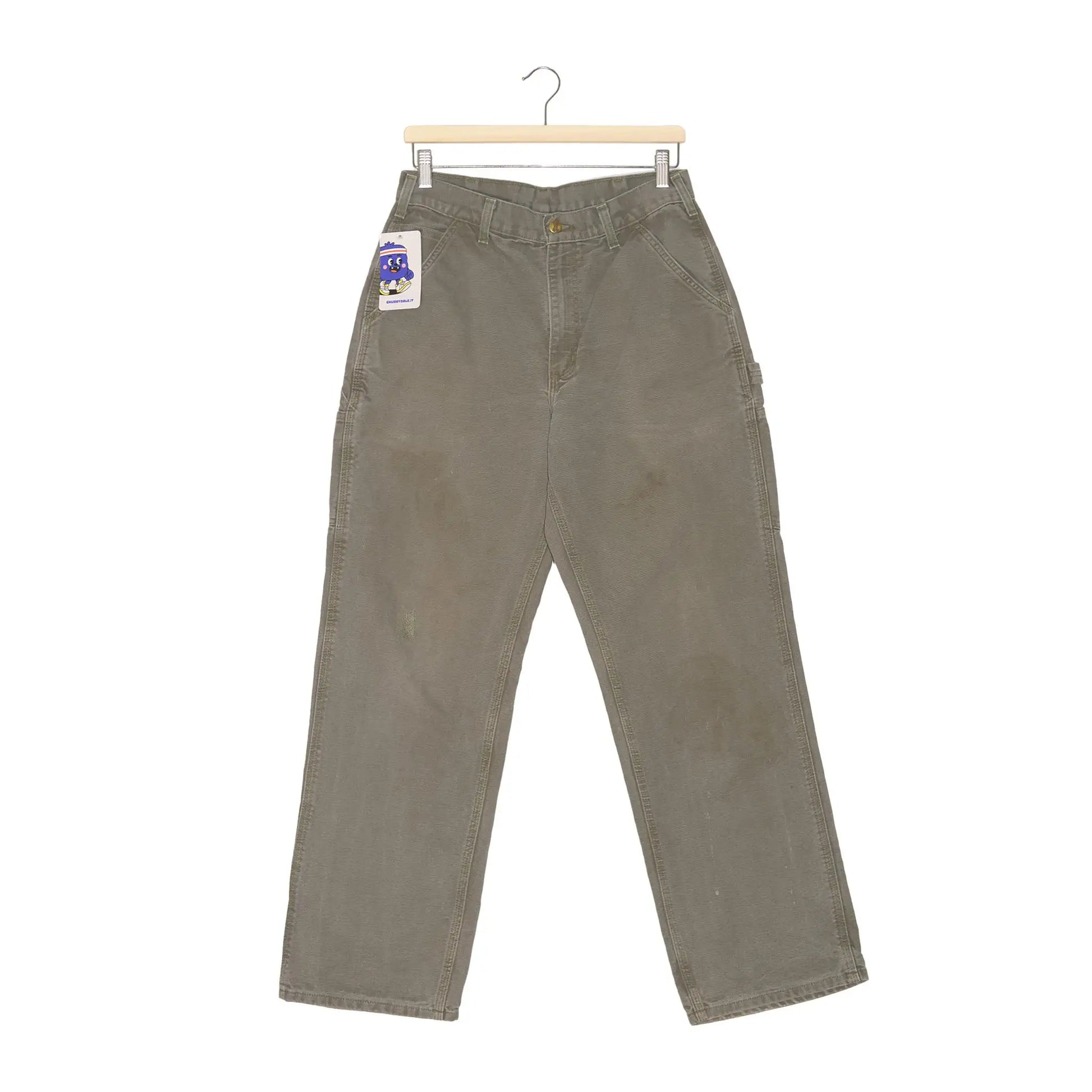 Work pant Carhartt modello B11 in colorazione Moss, realizzato nel classico Washed Duck che prende carattere nel tempo. Linea dritta, vita regolare e tasche posteriori rinforzate con patch Carhartt autentica. Il fronte mostra segni d’uso e piccole macchie che aggiungono quel mood vissuto tipico del vero workwear.