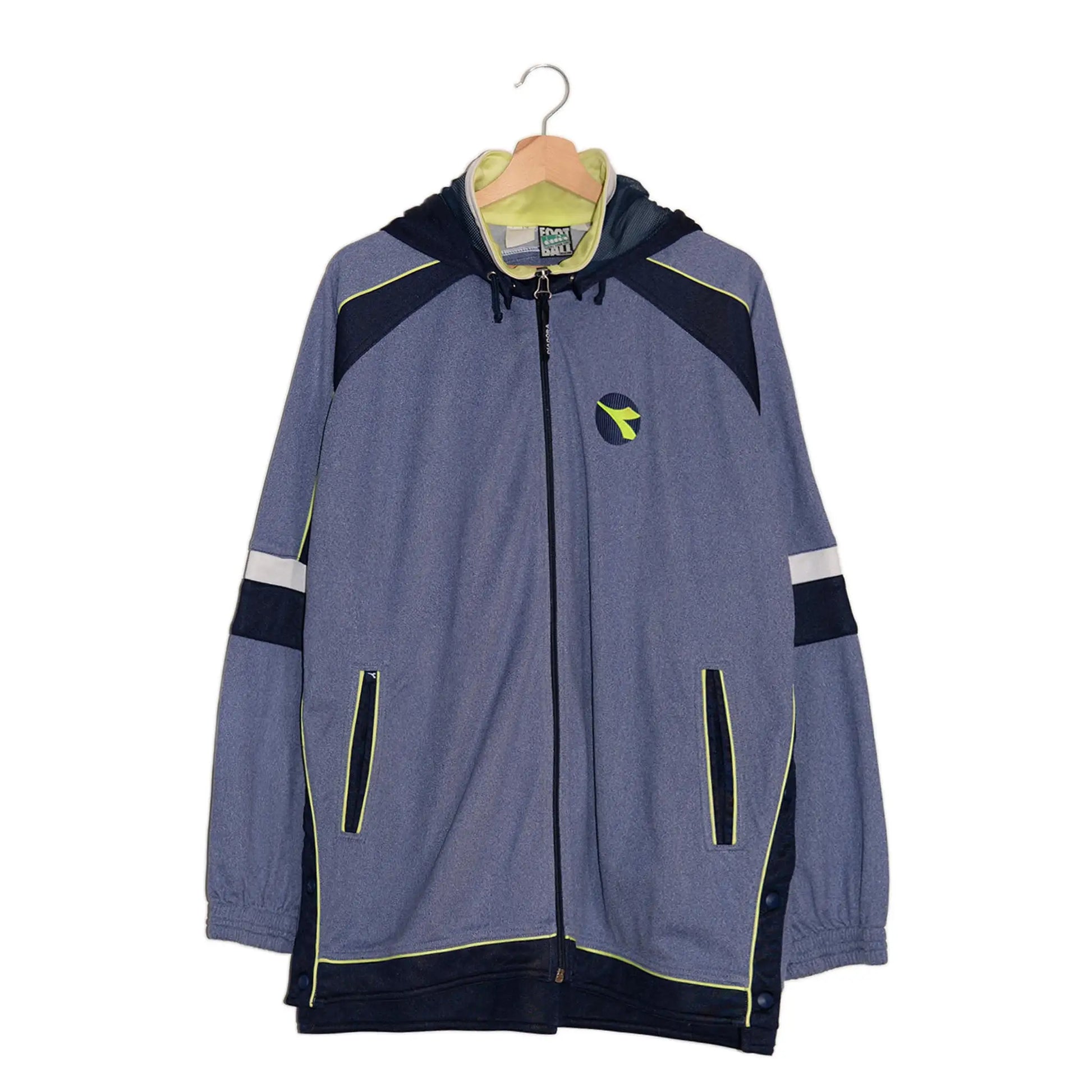Questo modello in tessuto tecnico leggero si distingue per il design bicolore blu e navy con dettagli in giallo fluo, inserti a contrasto sulle maniche e logo Diadora ricamato sul petto. La tracktop è dotata di cappuccio rimovibile, chiusura a zip frontale e bottoni a clip laterali che ne regolano la vestibilità, oltre a due pratiche tasche verticali con zip. Un capo che racchiude tutta l’energia e l’autenticità dello stile football vintage, perfetto per chi cerca un pezzo dal forte legame con la cultura sportiva italiana.