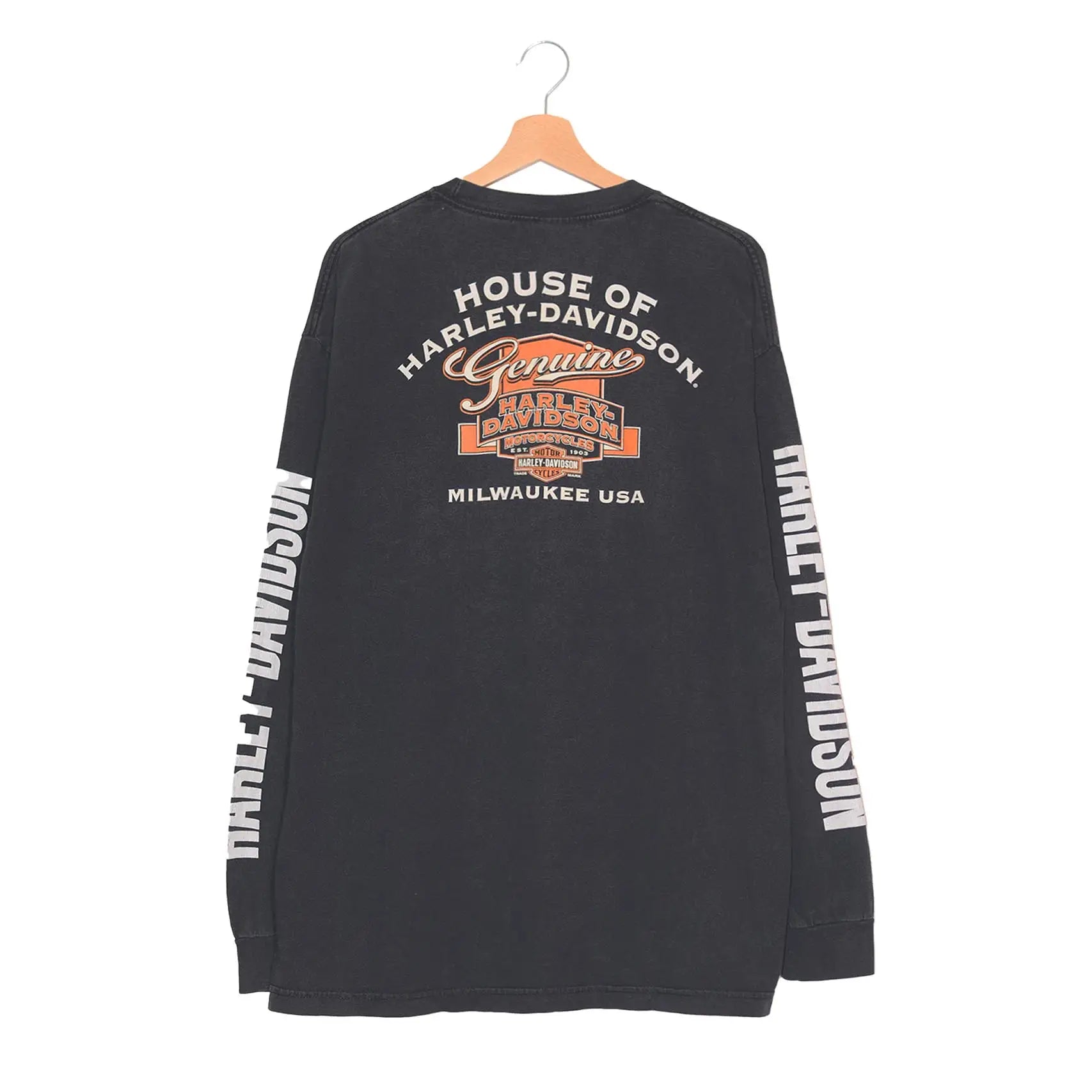 T-shirt a maniche lunghe Harley-Davidson proveniente dal dealer “House of Harley-Davidson” di Milwaukee, la città dove tutto è iniziato per il brand americano. Il fronte presenta il grande logo Bar & Shield in stampa arancione e crema, mentre sul retro la grafica richiama l’autenticità dei prodotti “Genuine Harley-Davidson Motor Parts”. Le maniche sono decorate con scritte bold in bianco che aggiungono un tocco da biker classico. Realizzata in cotone pesante, con vestibilità rilassata tipica dei modelli early 2000s, rappresenta un’icona della cultura motociclistica USA.