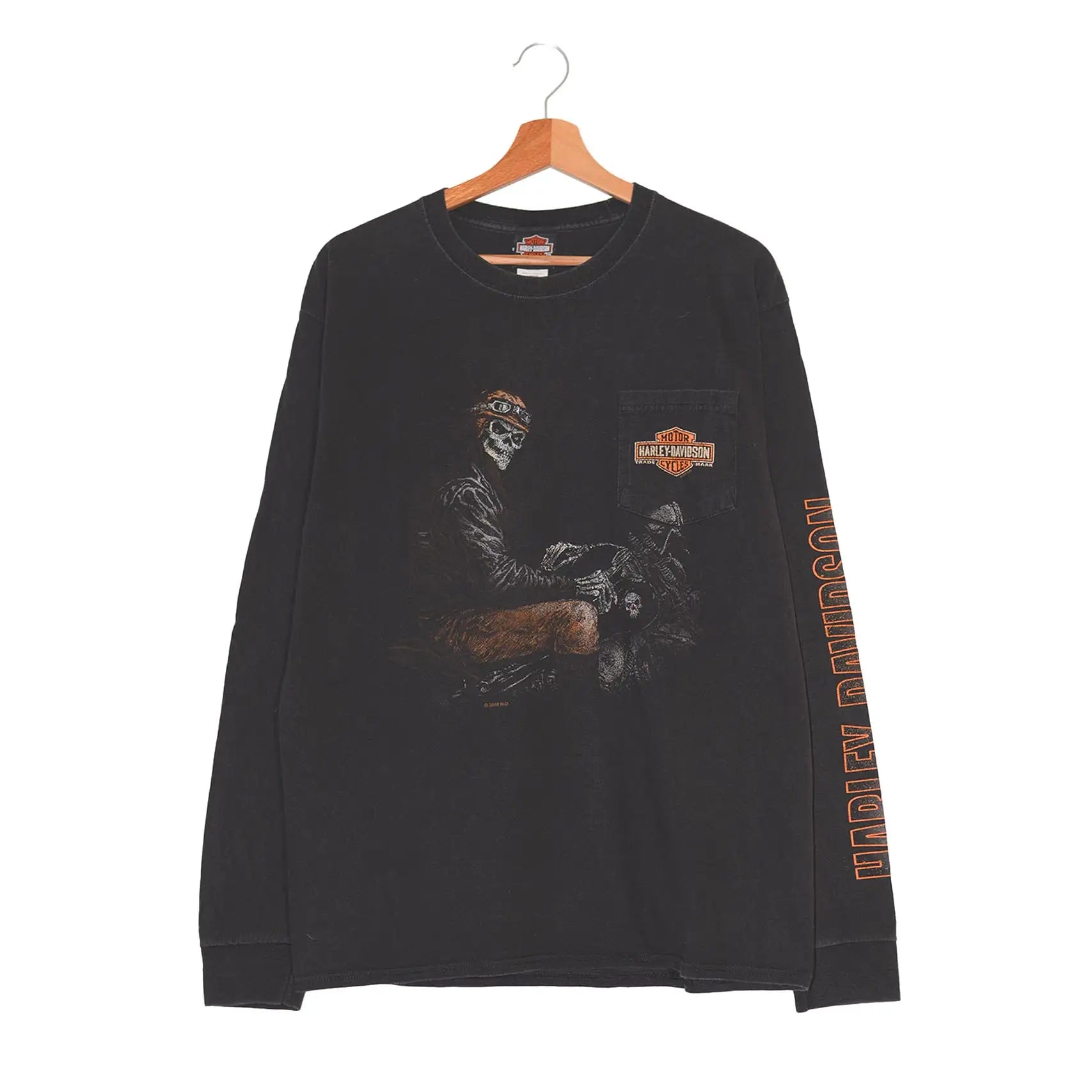 Maglia Harley-Davidson a maniche lunghe proveniente dal dealer Rocky’s Harley-Davidson di London, Ontario, Canada. Il fronte mostra una grafica illustrata con un biker scheletrico in sella alla sua moto e il logo Bar & Shield sulla tasca, mentre sul retro compare una stampa vivida con la fila di moto davanti alla sede del dealer canadese. Dettagli arancioni sulle maniche e vestibilità morbida in cotone spesso completano il look di questa tee da veri appassionati di motociclismo e cultura Harley anni 2000.