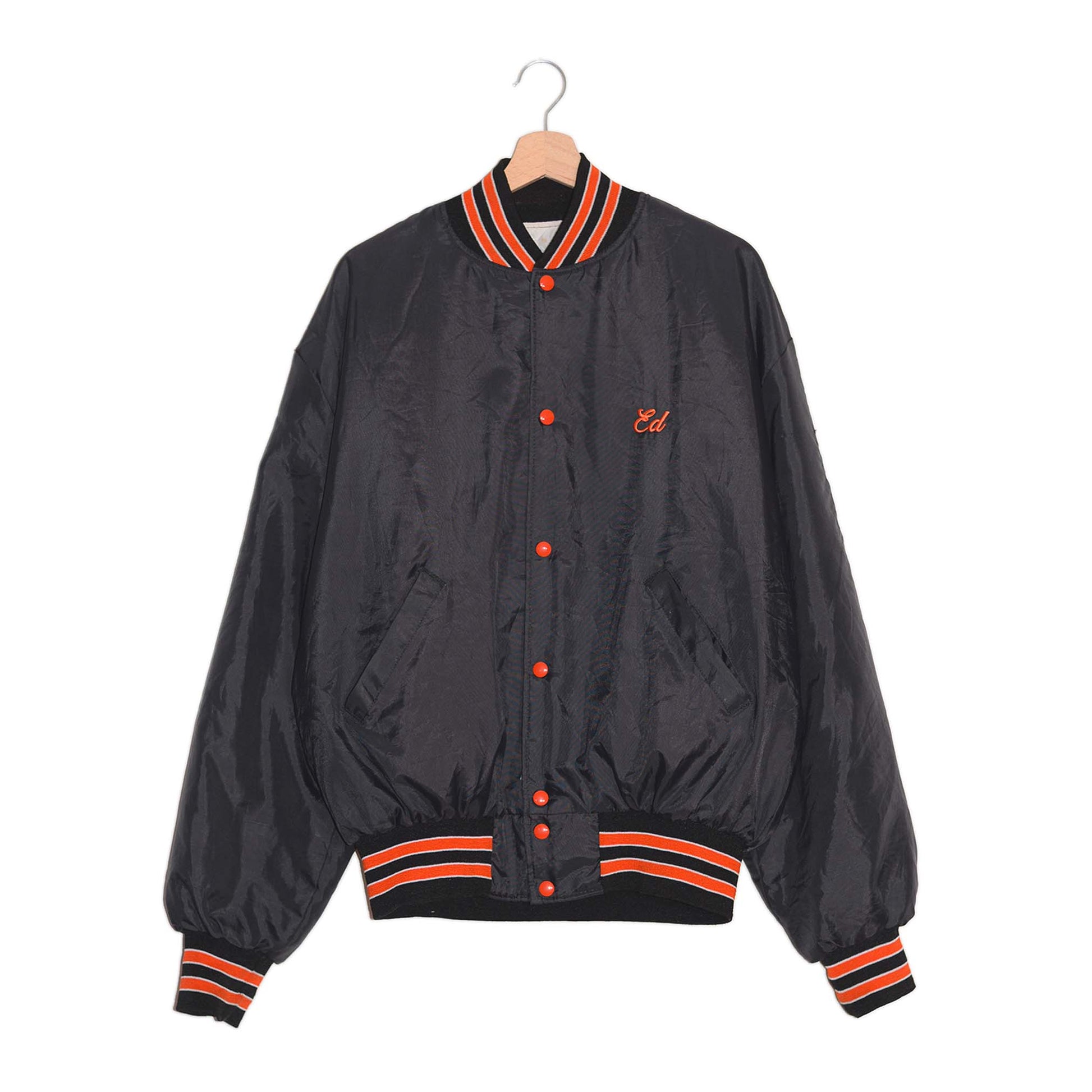 Realizzata in nylon leggero, con chiusura a bottoni automatici, dettagli arancioni e neri a contrasto, colletto/polsini/fondo a costine e ricamo “Ed” sul petto.